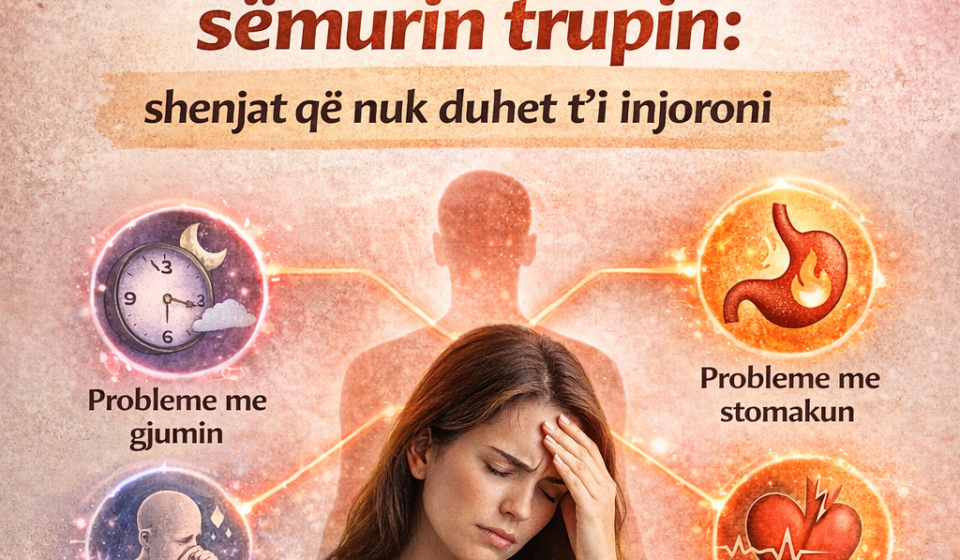 Kur jeni gjithmonë në nxitim, të shqetësuar dhe pa pushim, trupi nuk arrin të qetësohet. Ai qëndron në gjendje alarmi dhe fillon të shfaqë dhimbje koke, shtrëngim në qafë, rrahje të shpejta të zemrës dhe lodhje që nuk largohet as pas gjumit. Shumë njerëz shtojnë peshë në zonën e barkut sepse kortizoli qëndron i lartë për një kohë të gjatë.
